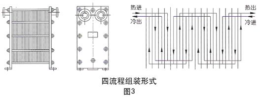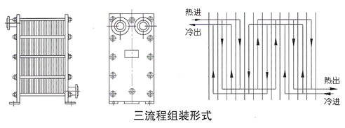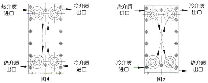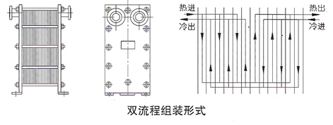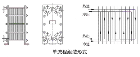 一般类似于水粘度较低的介质在换热流道内的平均流速为0.4m/s较为适合,流速过大,则阻力也大;流速过小,流道内流体流动不易形成湍流,易形成死区,换热效果不好。因此应根据介质流量的大小来选择流程数,使换热流道内的流速接近0.4m/s。 以获得好的换热效果。对于类似于液压油粘度较高的介质,流速应减小,0.3m/s较为合适。当流量较小时,可增加流程数来提高流速。例如当所确定的换热面积在表中所对应的流量比使用的流量大一倍时,采用双流程组装形式,换热流道内的流速就可增加一倍达到合适的流速。两个流道根据流量的不同可采用不相等的流程数。流程数增加,阻力也会相应增加。对于用蒸汽加热的换热器,蒸汽一侧一般应装成单流程的形式,以利于蒸汽的充分进入和冷凝水的顺利排出。 二.板式换热器的类型