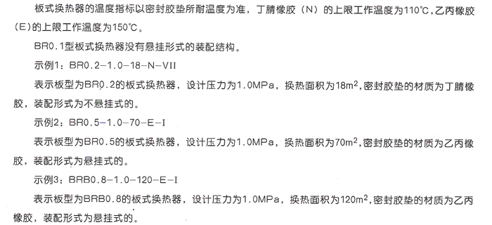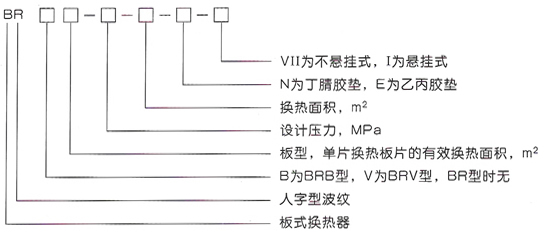 BR型板式换热器从小到大分为BR0.05、BR0.1、BR0.12、BR0.2、BR0.24、BR0.28、BR0.35、BR0.4、BR0.5、BR0.6、BR0.7、BR0.8、BR0.85、BR0.9、BR1.0 BR1.1、BR1.6; BRB型板式换热器从小到大分为BRB0.35、BRB0.5、BRB0.65、BRB0.8、BRB0.85、BRB0.9、BRB1.0、BRB1.2。BRV型板式换热器从小到大分为BRV0.08、BRV0.13、BRV0.20、BRV0.28、BRV0.45、BRV0.60、BRV1.0、BRV1.1、BRV1.7。BR0.1是指单片换热板片的有效换热面积为0。1平方米,其它型号的意义相同。选择某种型号采用不同数量的换热板片就可组装成所需换热面积的换热器。